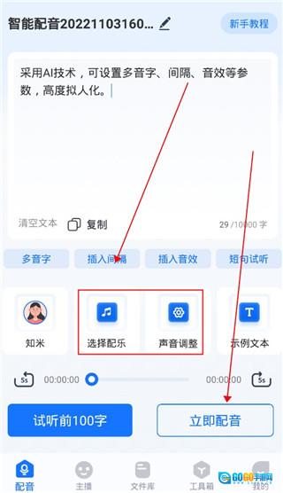 4、完成选择后,能够对背景音乐和声音间距进行设置,随后点击“立即配音”即可。