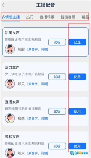 这款软件具备便捷的一键配音模式,还配有详尽的新手入门教程。它支持导入文档来完成配音操作,而且对音效素材进行了清晰分类。软件设有热门主播、精品主播、超高清主播、女声主播、男声主播等多个模块。