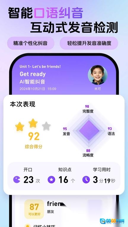 3. 借助AI智能精准检测与口语纠正功能,助力孩子习得专业且地道的英语发音。