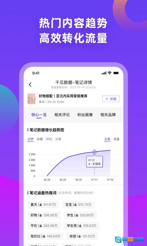 千瓜数据是一款专注于运营管理效率提升与数据分析的专业软件。它为广大用户提供了全方位的数据服务,涵盖全面的数据分析、排行榜单、笔记监控、记录监测以及投放管理等。同时,还给出小红书多维榜单、达人画像、竞品投放、营销结案、信息监测等一系列数据驱动的解决方案,助力企业在业务决策与品牌营销方面做出更优选择。 此外,该软件具备多维度的小红书达人榜单排名与达人推荐等实用功能,并且提供品牌投放分析、选品找号、营销效果追踪、舆情监控等数据服务,以协助品牌精准洞察市场需求,优化投放策略,实现精准投放,进而快速达成业务增长。
