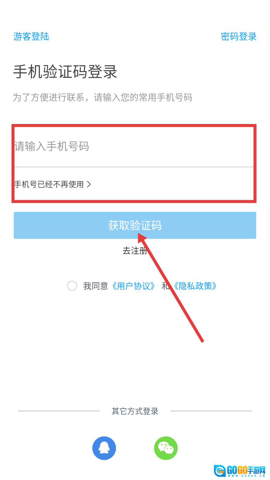 4、填入手机号码,随后点击【获取验证码】,如此便可完成登录流程。