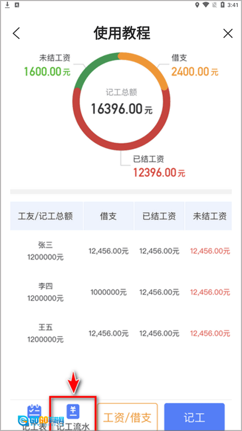 4、于记工流水处,能够查看当下的流水情况。点击任意一条流水,即可查看其详细信息,并且可以对其进行修改或删除操作。