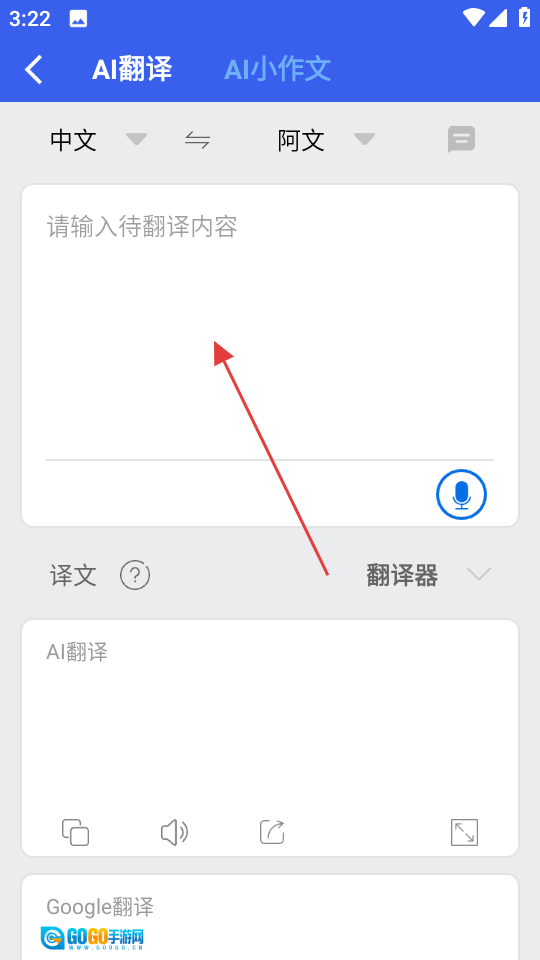 2、在AI翻译界面,你能够选择中文与阿文之间的翻译方向,输入需要翻译的内容后,即可获取AI翻译的结果,还能够切换至Google翻译,查看不一样的译文。
