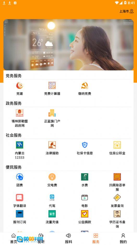 1. 这是正蓝旗广播电视台打造的融媒体移动平台,该平台涵盖新闻、视听、服务、爆料等诸多功能内容。