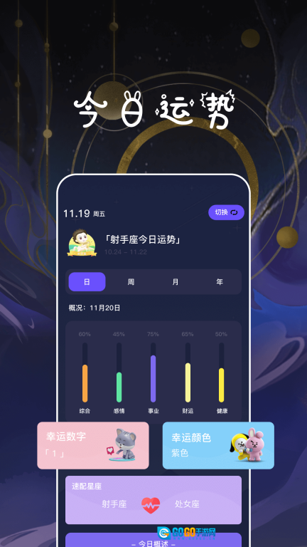 根据您的星座特性,给予精确的运势预报以及情感引导,助您了解每日的运势变化,调节情绪,坦然面对。