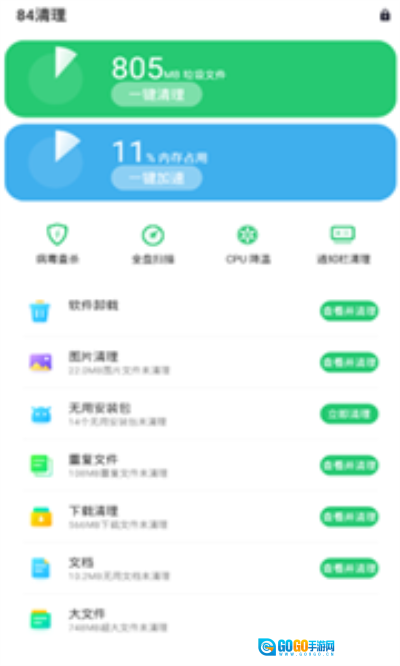 84清理是一款功能极为强大的安卓手机清理软件,具备图片清理、病毒查杀、内存加速、全盘扫描以及重复文件清理等一系列高级功能。它能够实时协助用户清理手机中的垃圾文件,进而提升手机的运行效率。不仅如此,84清理还支持拦截那些无用的通知,依据手机实际状况提供恰当的优化方案,让手机的通知栏变得整洁有序且高效,延长手机的待机时长,实现CPU降温,使手机如同刚入手时那般清爽流畅。这款软件操作便捷,效果显著,强烈推荐大家体验一番。