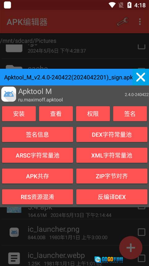 3、支持长按对apk文件进行直接解包、打包以及对APK安装包直接签名。