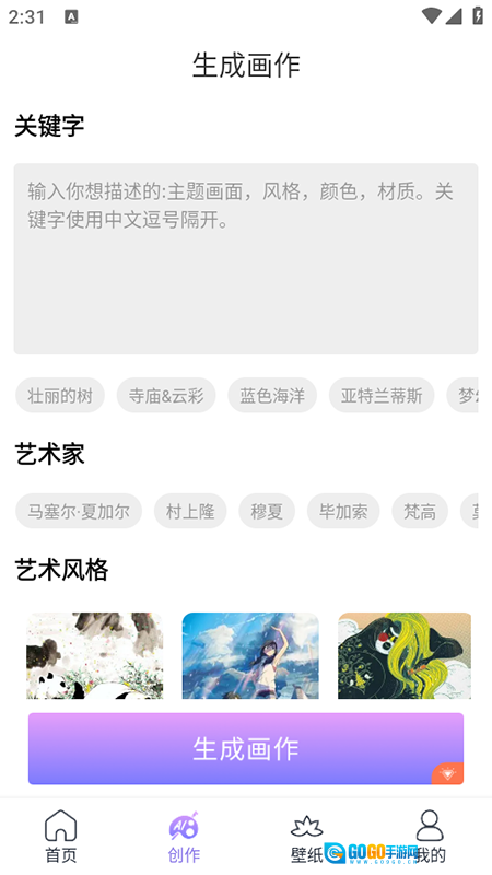 2. 在创作板块的输入框里描述关键字,并挑选与之对应的艺术风格。