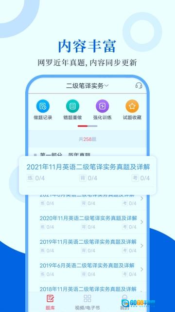 CATTI英语App堪称CATTI英语考试刷题学习的得力神器!这款App囊括了各个等级科目的考试题库资源,丰富的题库内容支持在线刷题。不仅如此,它还配备了各类辅导电子书、红宝书以及考点手册。并且,会依据大家的学习情况智能推荐相关的考试电子书与视频课程,帮助大家实现畅学无忧的在线学习体验。别犹豫啦,赶紧行动起来!