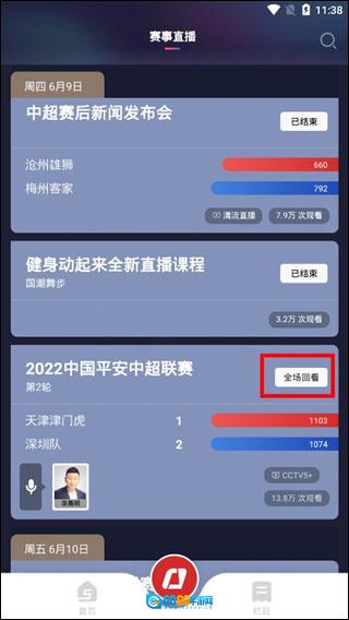 2、在此处能够看到近期的直播赛事,点击“全场回看”即可。