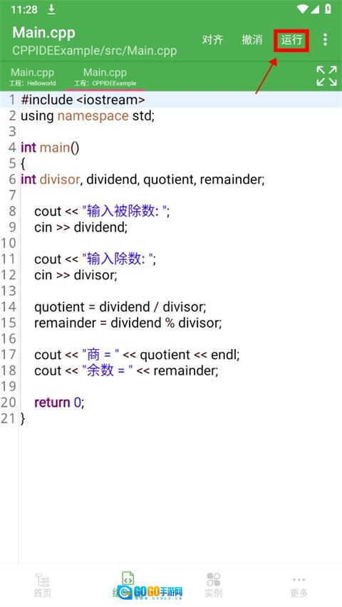1. 打开C++编译器IDE,在编辑器界面,编写完代码后,点击右上方的运行按钮就能运行代码。