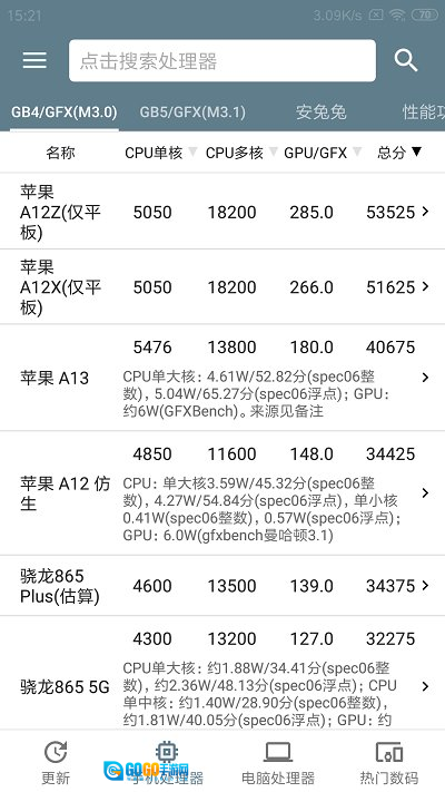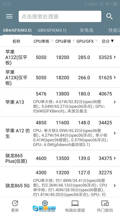 1、移动评分:查看最新的移动CPU评分、多核心评分、GPU评分以及总评分。