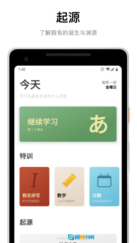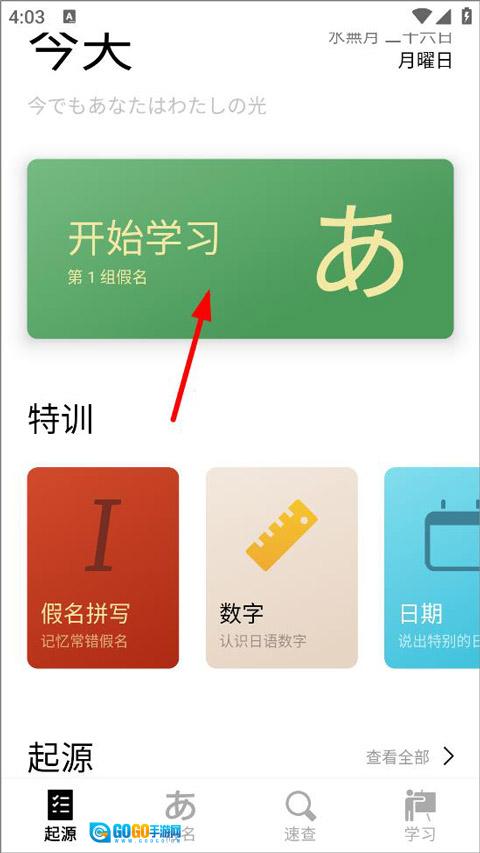1. 用户开启50音起源,进入首页后,能够对今日学习计划、特训、起源等进行设置,随后点击“开始学习”。