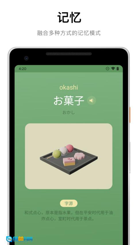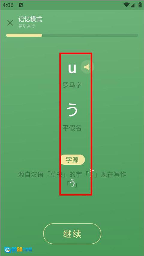3、开启学习记忆模式测试,用户依据所给出的罗马字、平假名以及汉语字源展开学习。