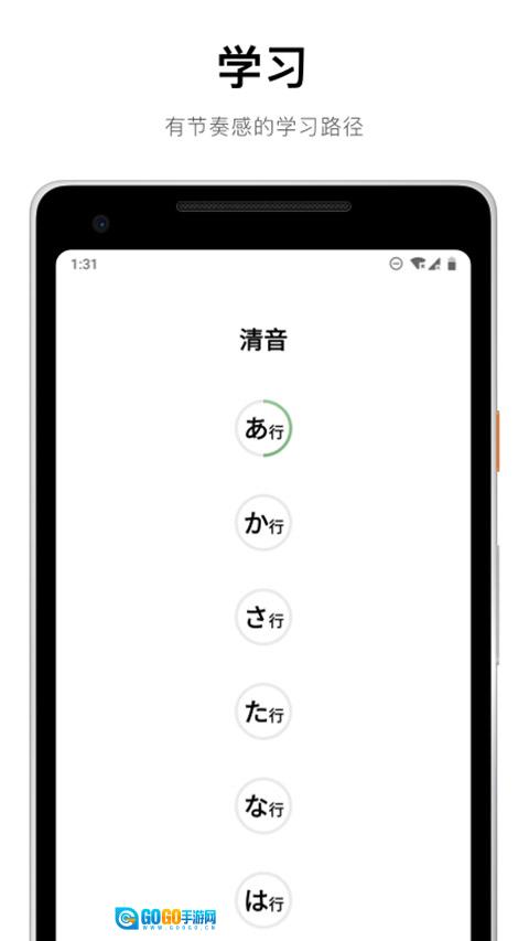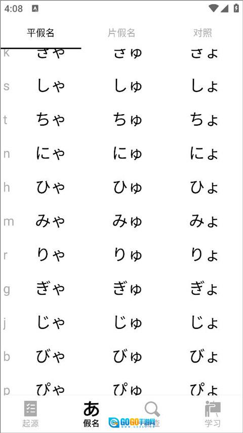 4、进入假名页面,用户能够学习平假名与片假名的清音、浊音以及拗音。