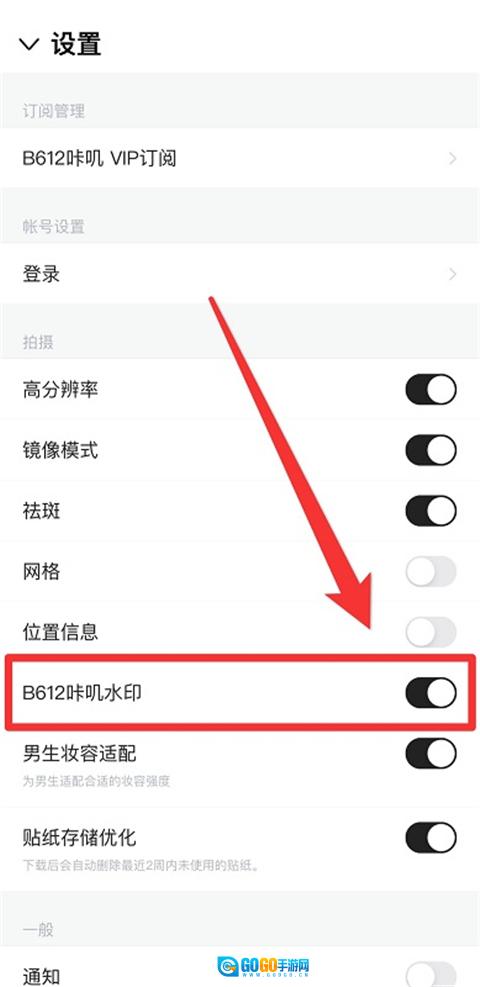 3、于页面中寻觅“B612咔叽水印”,能够瞧见其右边的按钮呈现黑色的开启状态。