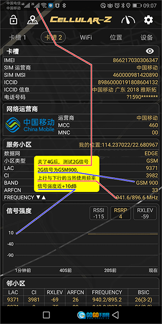 2、由于移动关闭了4G功率,因此测试所得的手机信号为2G信号。