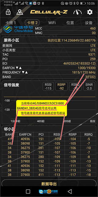 4G信号方面,BAND38和BAND41也能够使用,这是由于在邻近基站数据里存在BAND38和BAND41。然而,这两个基站的信号状况比较糟糕,强度处于 -105dBm 。所以,在并非迫不得已的情况下,不建议使用。要是信号强度在 -90dBm 以上,那么就可以从中挑选一个合适的频率来使用。