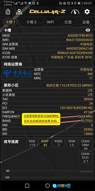 1由于电信的2G尚未关闭,因此测试得到的信号为电信4G信号。