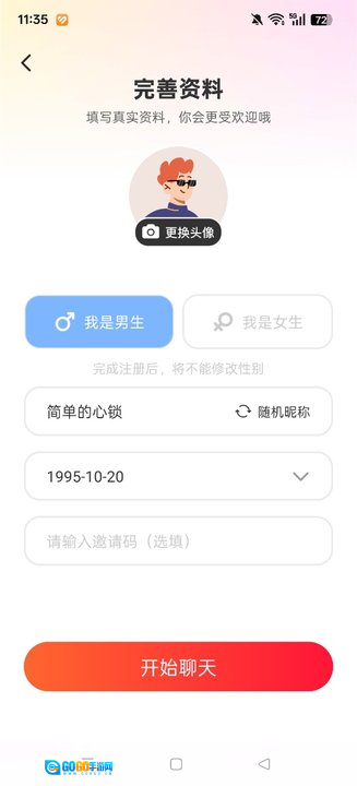 3、完成快捷注册登录后,第一步需完善个人资料信息,包括设置个人头像、性别及昵称。资料补全后,即可进入软件内部。
