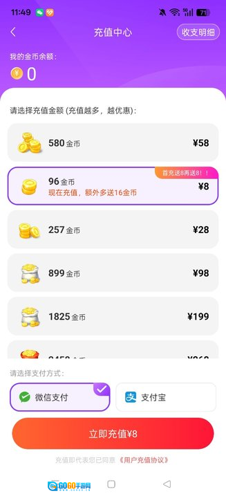 3、在进行线上支付时,选择相应的金币数值,随后借助微信或支付宝来完成购买操作。