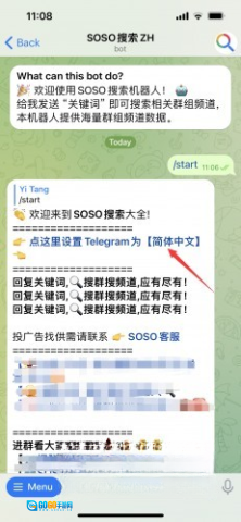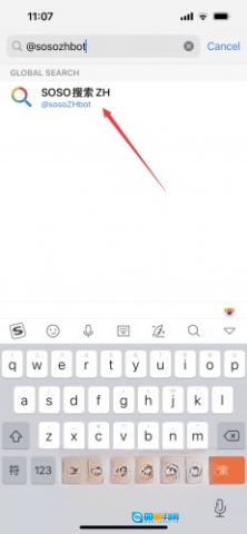 2. 在搜索框内键入“@sosozhbot”,然后点击搜索出来的结果。