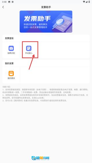 3、于发票助手界面,点选手动录入选项,从而进入发票查验页面。