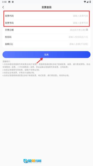 4、于发票查验页面,按顺序填入发票代码、发票号码、开票日期、校验码、金额等相关信息,接着点击验真按钮,即完成发票的查验操作。