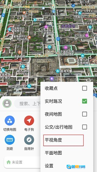 5、点击搜索旁的三个点,能够查看实时路况、夜间地图、公交/出行地图,还有俯视3D角度、平面地图。