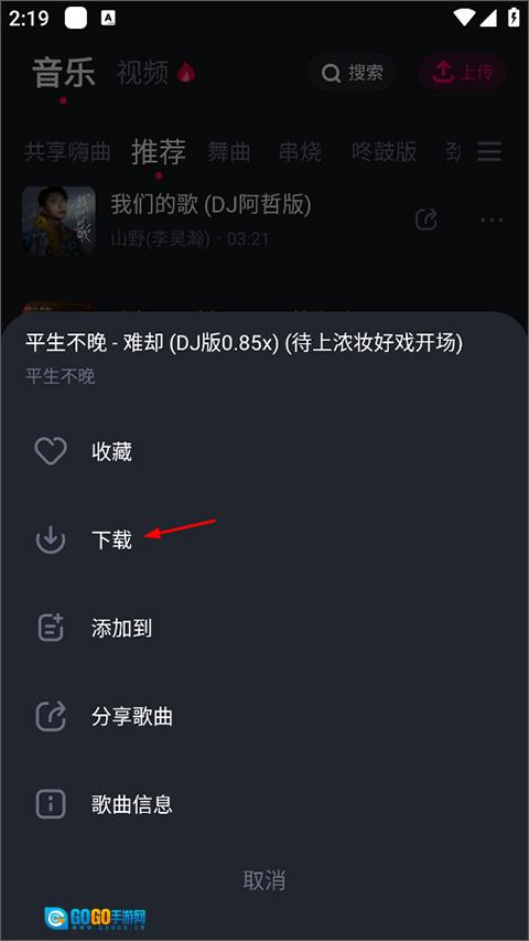 2. 打开歌曲功能栏,用户点击按钮,即可进行收菜或分享歌曲的操作。