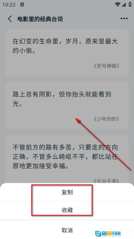 在主页推荐处,向下拉动就能选择复制或者收藏句子。