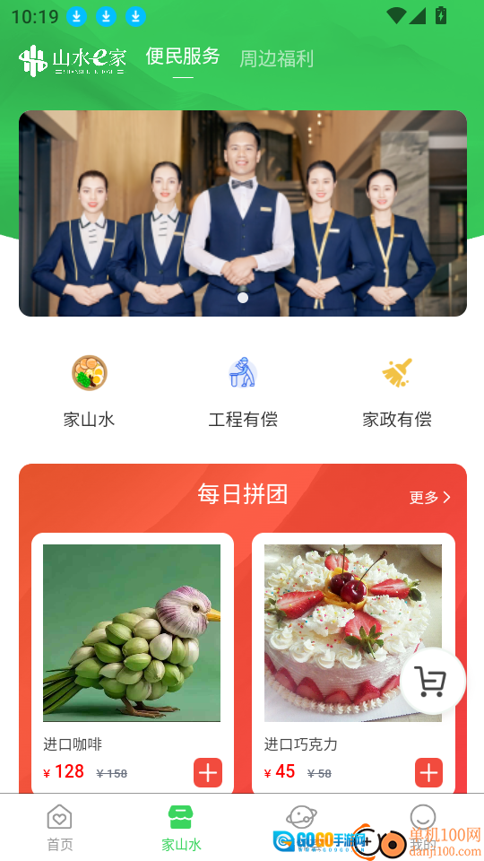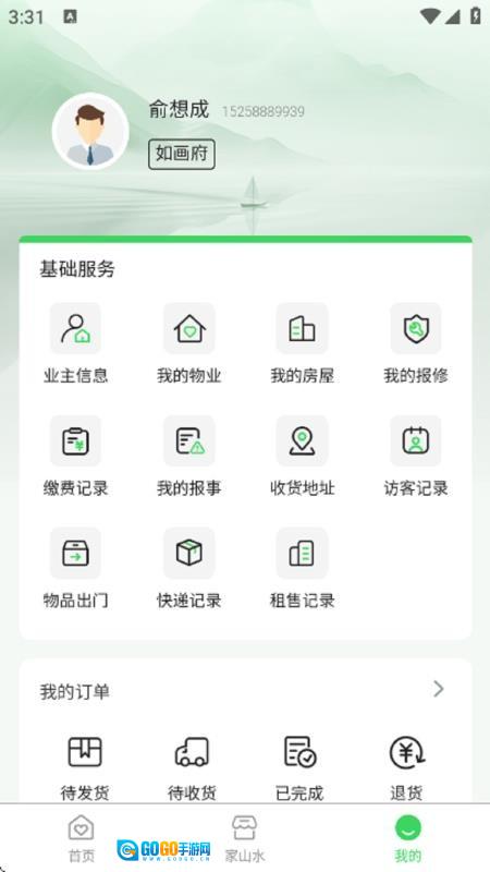 3、接下来,在首页界面底部的菜单栏里,找到“家山水”功能按钮并点击进入。
