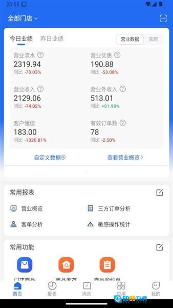 2. 一进入应用的首页,就能查看门店的经营业绩,同时也可以查看众多报表信息。
