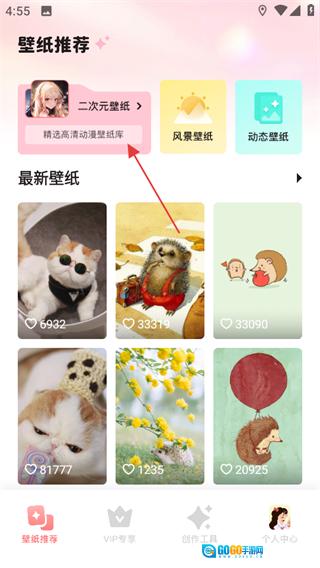 1. 在壁纸推荐界面,点击二次元壁纸选项,从而进入二次元壁纸界面。