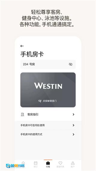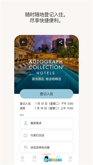 支持通过手机提前48小时办理登记入住,可自行设置抵达时间,随后接收客房准备妥当的提醒。同时,能生成手机钥匙,用于开启客房以及健身中心等设施。不仅如此,还能将钥匙分享给3位伙伴。离店时,直接在手机上完成退房操作。