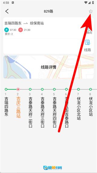 4、当您进入线路详情页面,便能清楚看到该线路各站点的分布情况以及运营时间。在页面右上角,有个星形图标,点击它,即可将这条公交线路收藏。