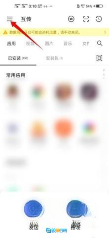 1、于旧款vivo手机中安装“vivo互传一键换机”,安装完成后将其打开。接着点击左上角的三道杠图标。