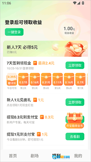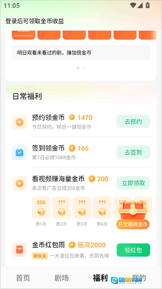 1. 登录之后领取新人专属红包,并赚取平台金币。
