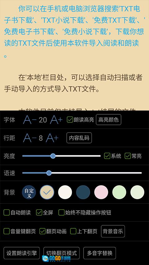 4、阅读小说过程中,能够对字体大小、颜色及背景进行调整,也可以调节屏幕亮度。在朗读小说方面,不仅有多种朗读引擎TTS和众多发音人可供选择,还能够调整语速,并且可以设置朗读时的背景音乐。