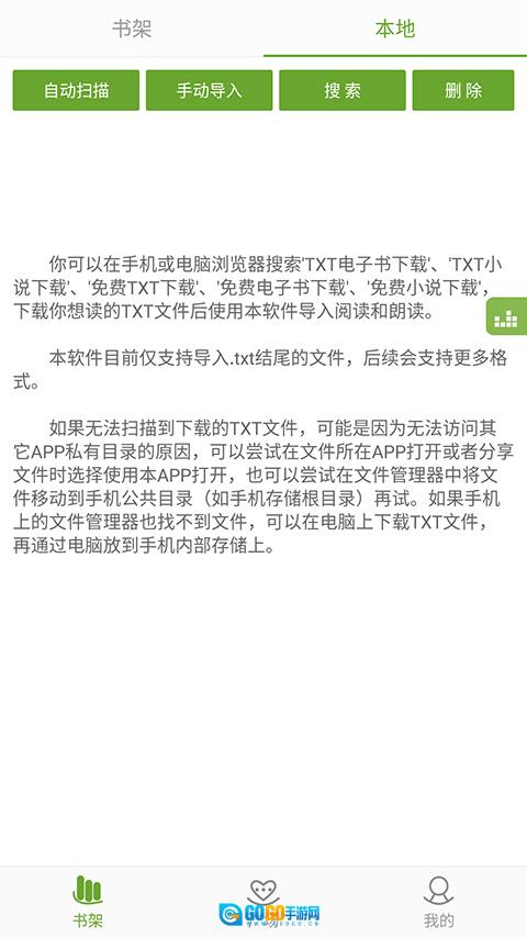 3、可全自动搜索并导入手机中已有的TXT文本小说,导入的本地小说能够进行智能扫描,分析章节目录。