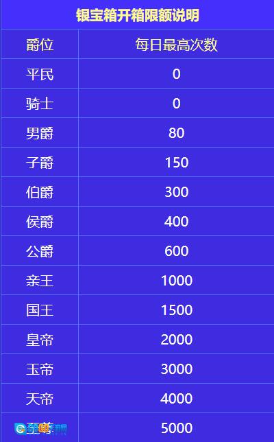 宝箱是平台用于提升活跃度的道具,为防止用户过度开箱,平台针对各爵位银宝箱的开箱次数设置了一定限度。
