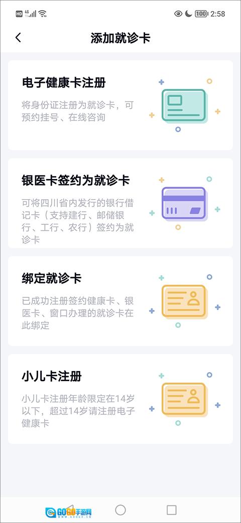 4、在就诊卡添加界面,能看到四种形式的就诊卡,分别为电子健康卡注册、银医卡签约成为就诊卡、绑定就诊卡以及小儿卡注册。