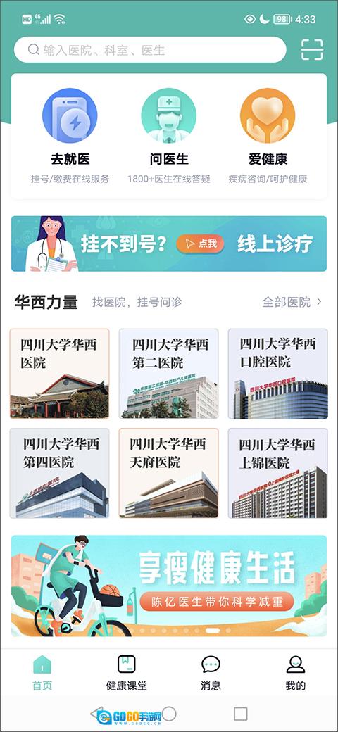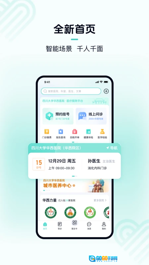 2、【智慧就医】具备以下功能:可用于四川大学华西医院、华西第二医院、华西口腔医院、华西第四医院以及华西各联盟医院的挂号、门诊缴费、住院预交金缴纳、报告查询等。