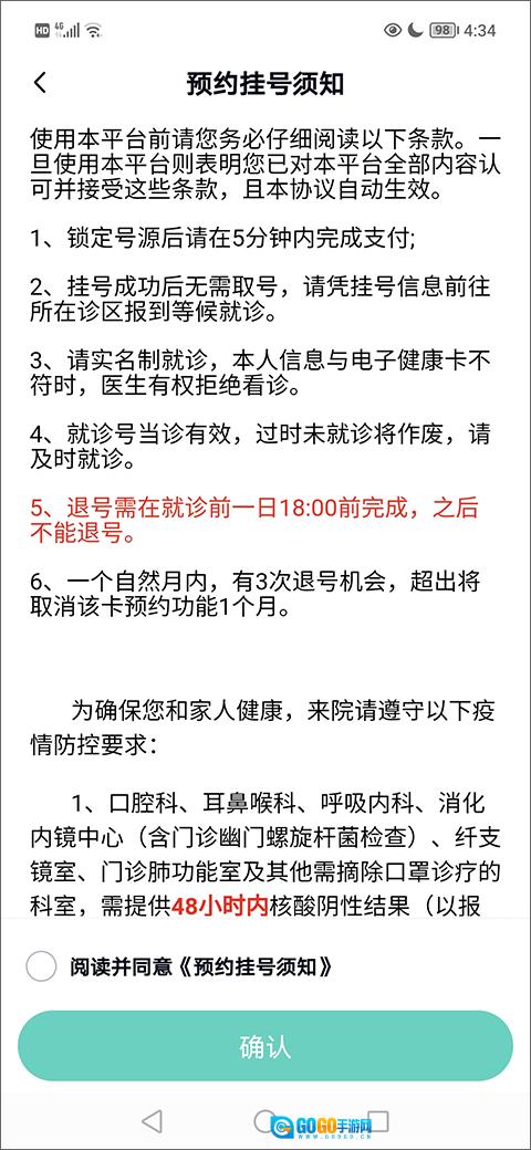 5、勾选阅读并同意《预约挂号须知》,随后点击确认按钮。
