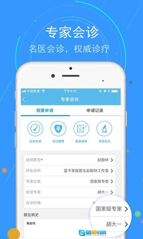 2、提供远程会诊服务,医疗团队由蓝卡家庭医生、蓝卡线上专家团队、全国知名专家以及各大三甲医院的专家共同组成,会诊由专家亲自进行。