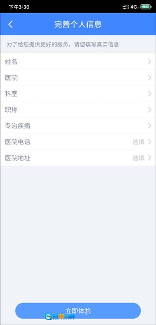 立即体验,完成注册——输入姓名、医院、科室、职称。