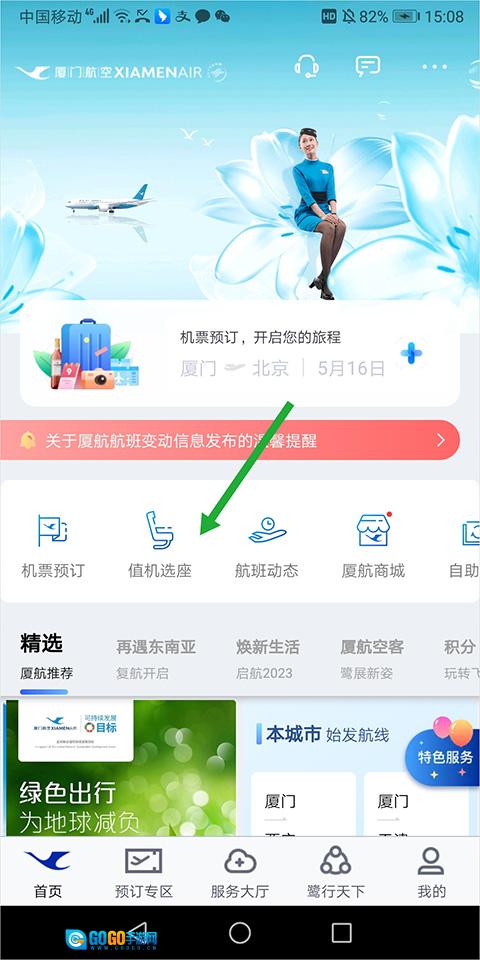 用户在本站选择厦门航空后,在手机上安装并登录相关应用,打开应用进入首页后,点击【值机选座】。