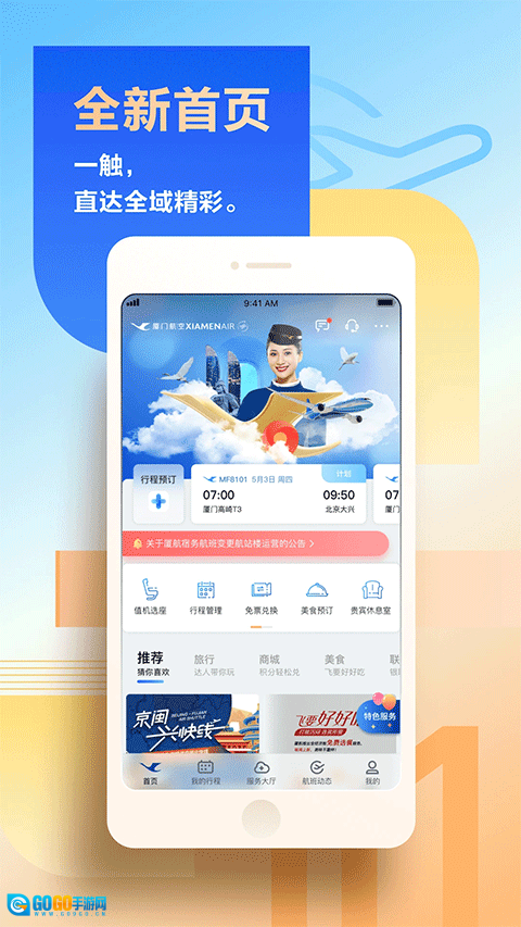 1、全新感受:以崭新视觉,领略碧海蓝天与厦航蓝的美妙;开启新互动模式,实现颜值与才华的双重进阶;带来新体验,让购票服务更加顺畅愉悦。