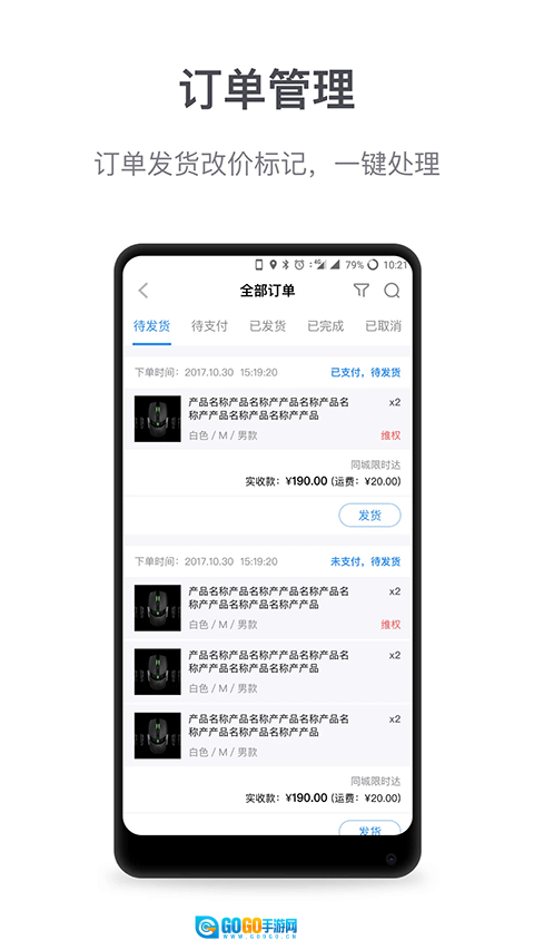 订单管理涵盖对订单执行筛选、发货、改价、标记以及取消等操作。
