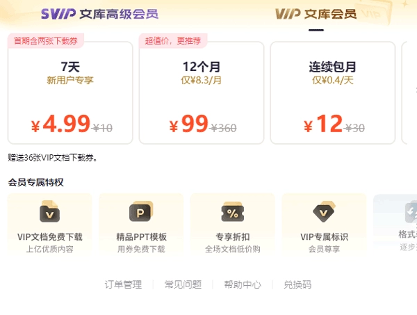 当前,360文库仅设有一种会员类别。用户购买会员后,可免费获取一定数量的360文库VIP文档与PPT模板,同时全站文档均以会员折扣价提供。